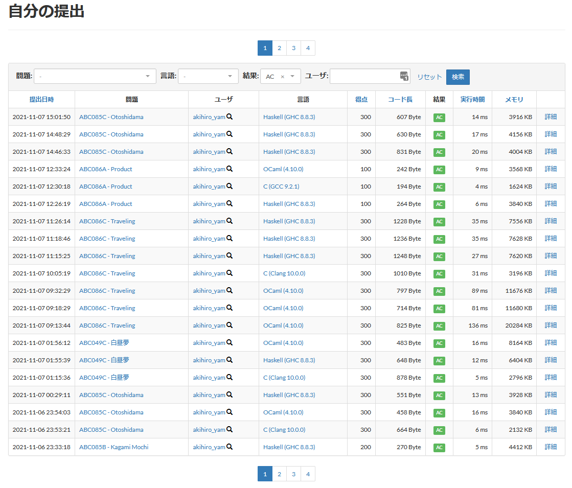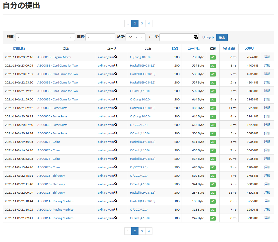 「AtCoder に登録したら次にやること ~ これだけ解けば十分闘える!過去問精選 10 問 ~」という記事にある「AtCoder Beginners Selection」10問をOCaml/Haskell/C言語で解いてみた。