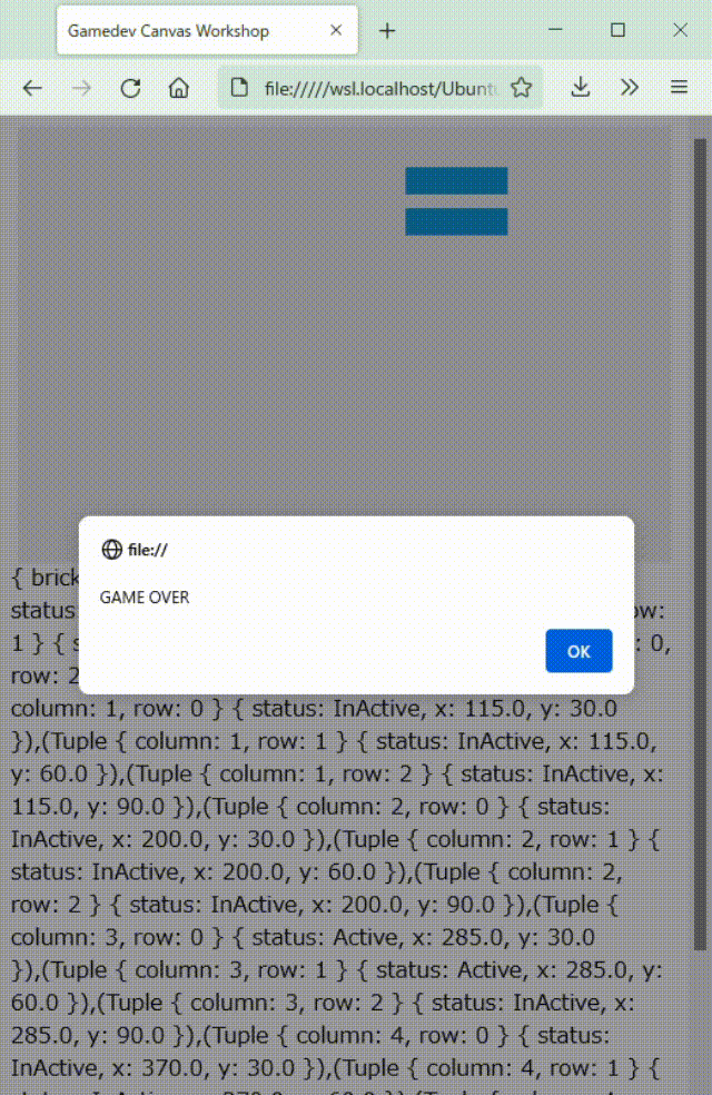 最初の第一歩として、毎フレーム描画されるたびに全てのブロックを通してループし、ひとつひとつのブロックの位置をボールの座標と比較する衝突検出関数を作成しましょう。コードがより読みやすくなるように、衝突検出のループの中でブロックオブジェクトを保存する変数bを定義します。