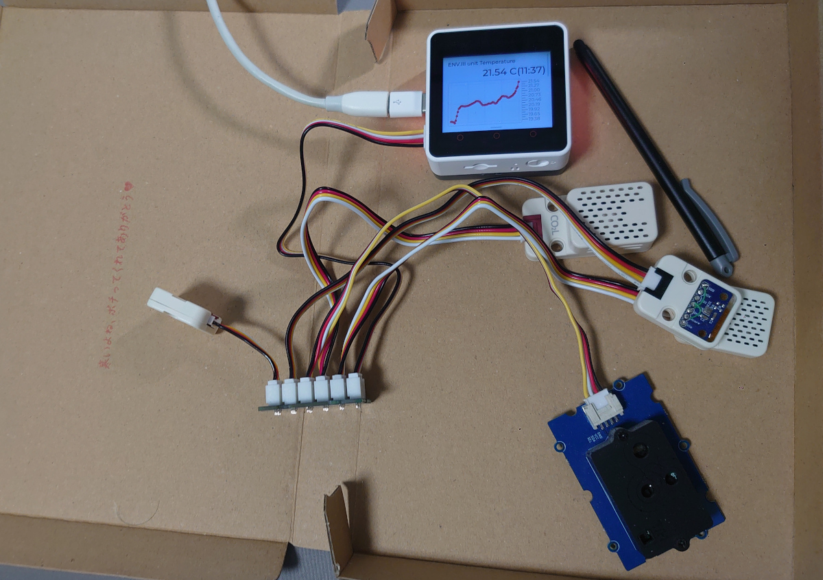 こういうふうに M5Stack の I2C ポートである Port.A にハブ経由で全部つなぐだけ