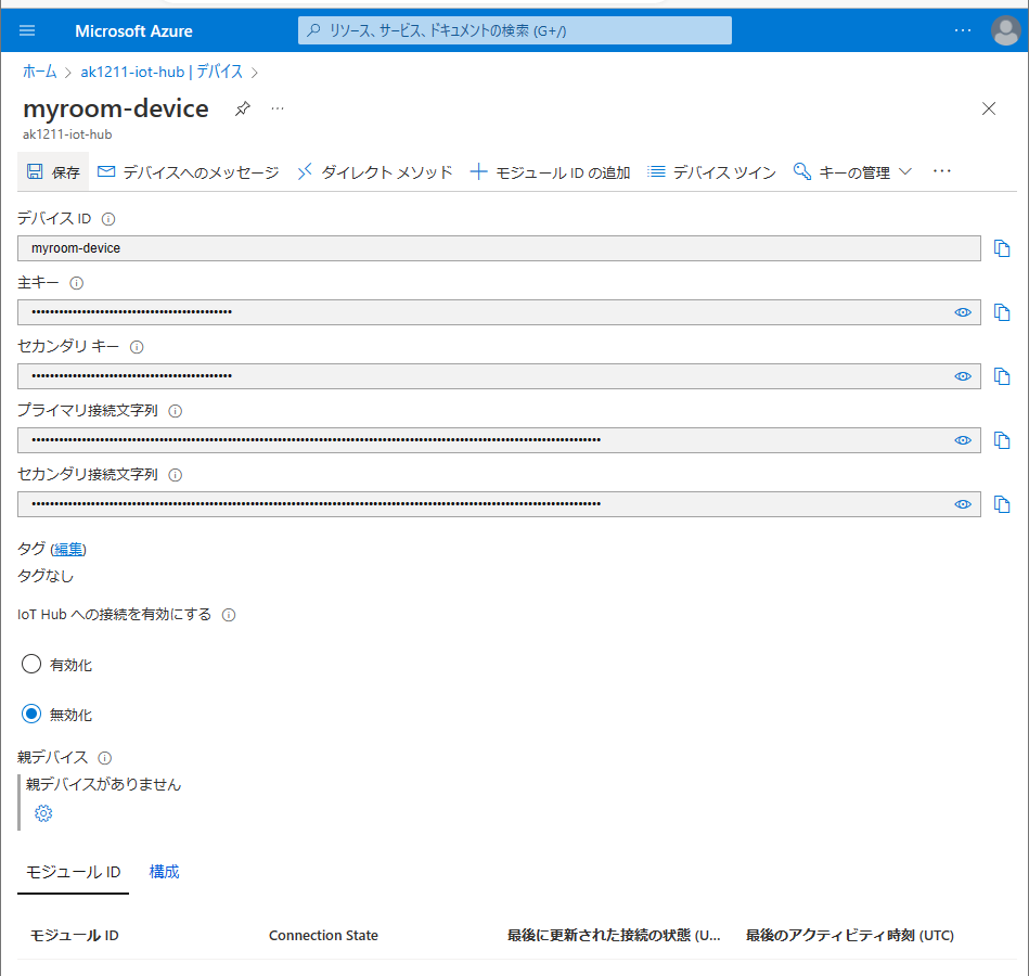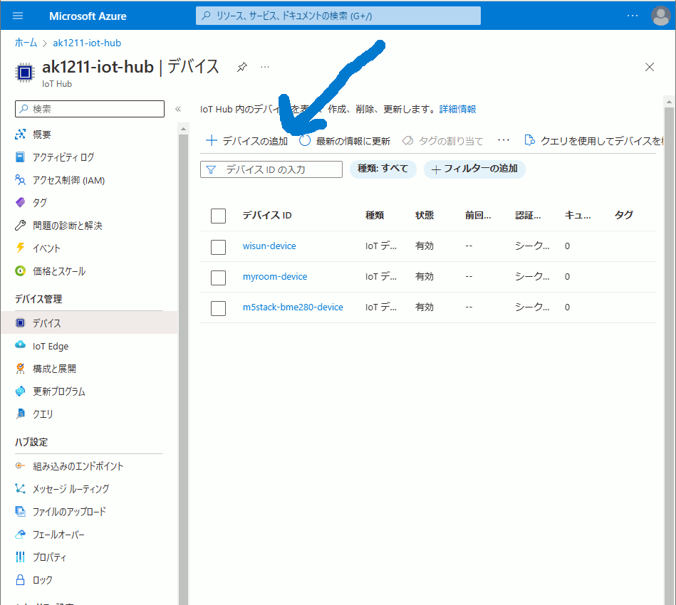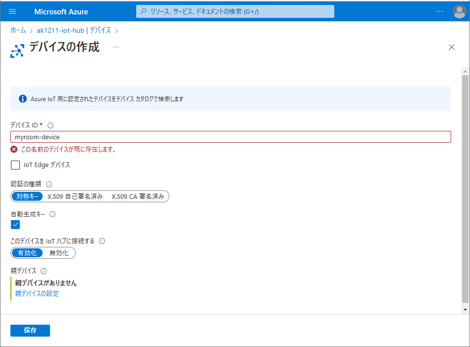 Azure IoT Hub の「デバイスの追加」から「デバイスの作成」に移動してデバイス ID を入力して保存することで