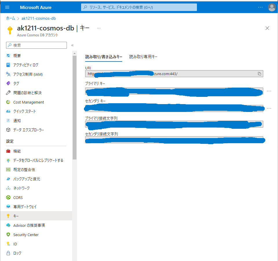 CosmosDB の URI と CosmosDB のキーはこの画面にある。